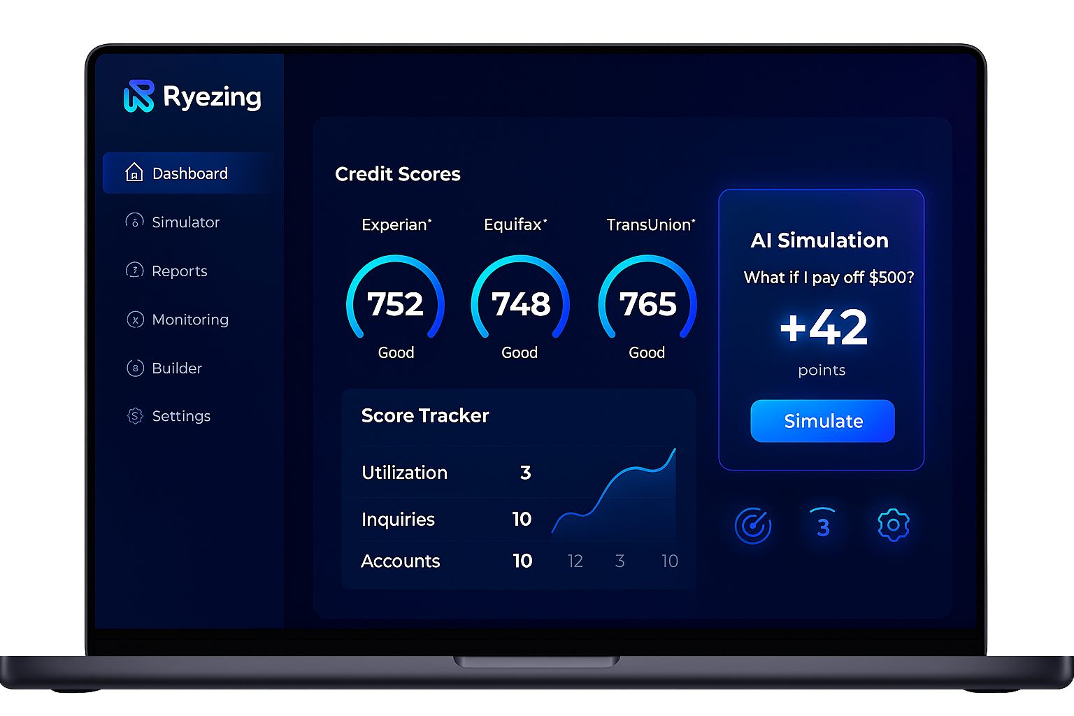 Ryezing is a modern credit-tracking platform built to help you understand, improve, and take control of your credit with total confidence. With real-time alerts, clear insights, and a powerful credit score simulator.