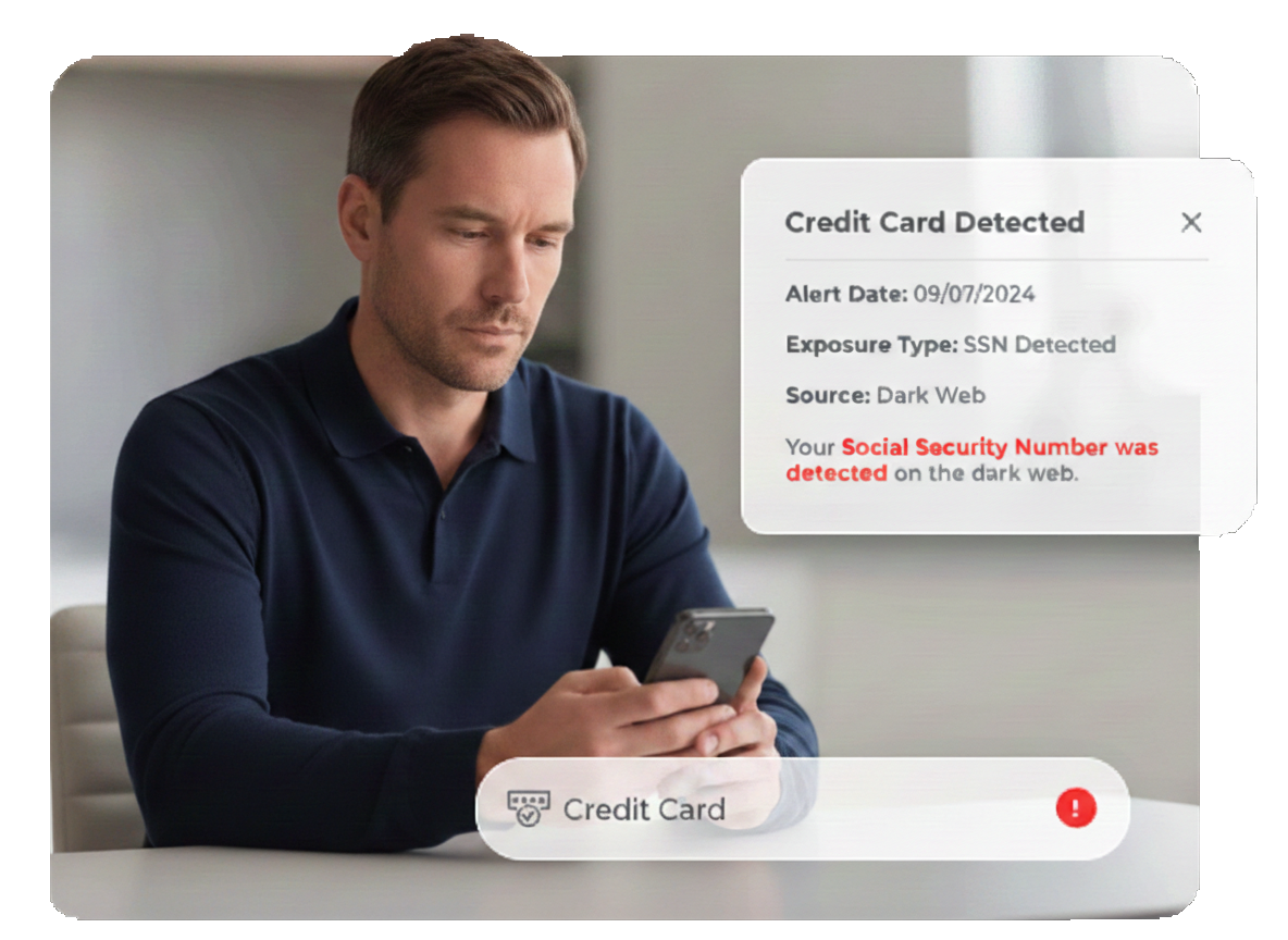 We search the darkest corners of the internet — hidden marketplaces, forums, and chat rooms — where stolen personal infornnation is bought and With the expertise of former FBI agents, law enforcement professionals, and white hat hackers, we proactively monitor for your data in real-time. Whether it’s your Social Security number, credit card details, or email address, our system continuously tracks and detects threats as they emerge. The moment your information is found, we send you an alert, giving you the chance to act immediately and prevent criminals from exploiting your stolen or leaked data.